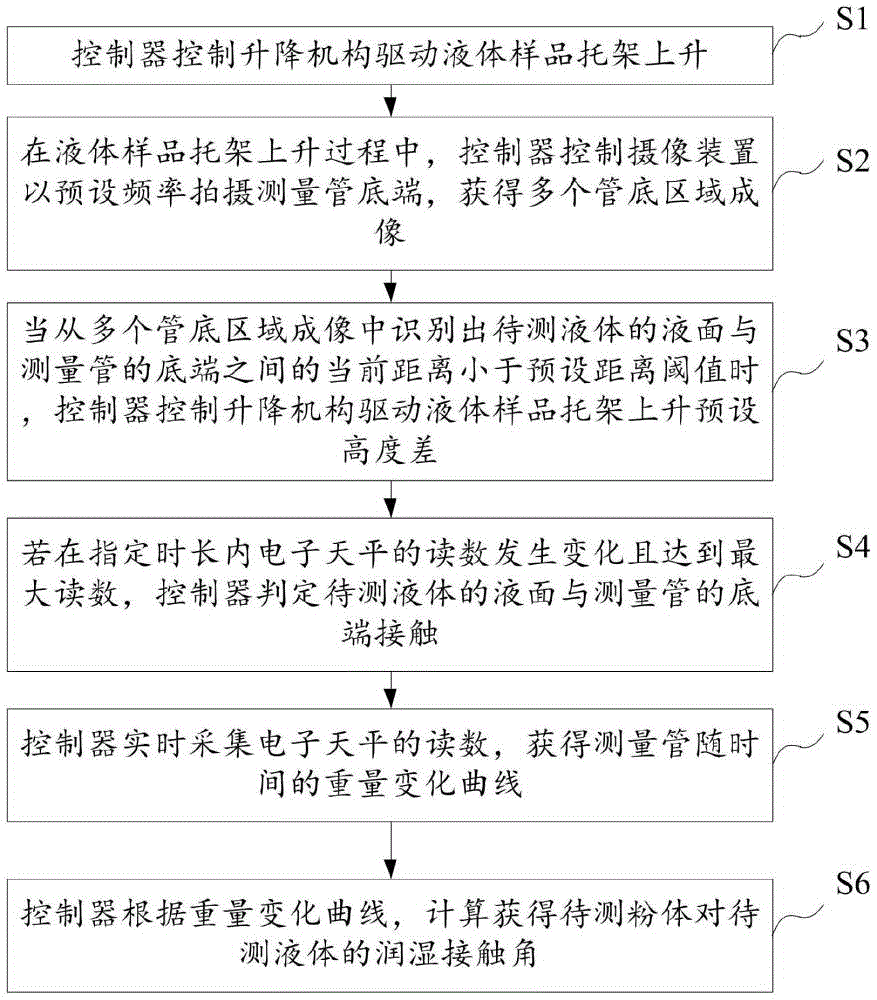 為此,現(xiàn)有技術(shù)中提出一些理論,即可選擇潤濕過程中在各個時間段測量粉體床內(nèi)液體質(zhì)量,從而得出質(zhì)量對時間的變化,求取液體對固態(tài)粉體的接觸角。但是,每次稱重測量時,需要將樣品測量管提出液面并擦去連帶的水分,操作比較繁瑣,且無法精確控制每次擦除的液體量,造成了稱重測量過程中的不連貫性,也會使得結(jié)果誤差放大。