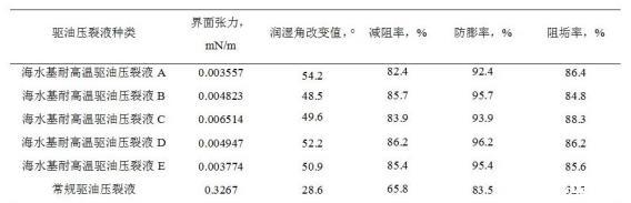 mN/m,潤濕角改變值≥40°,減阻率≥70%,防膨率≥90%,阻垢率≥80%。從表2中數(shù)據(jù)可以看出,新研究的海水基耐高溫驅(qū)油壓裂液,在實驗溫度180℃條件下,各項指標均達到海上油田的要求;在相同條件下,其界面張力值、潤濕角改變值、減阻率、防膨率、阻垢率均優(yōu)于常規(guī)驅(qū)油壓裂液產(chǎn)品。