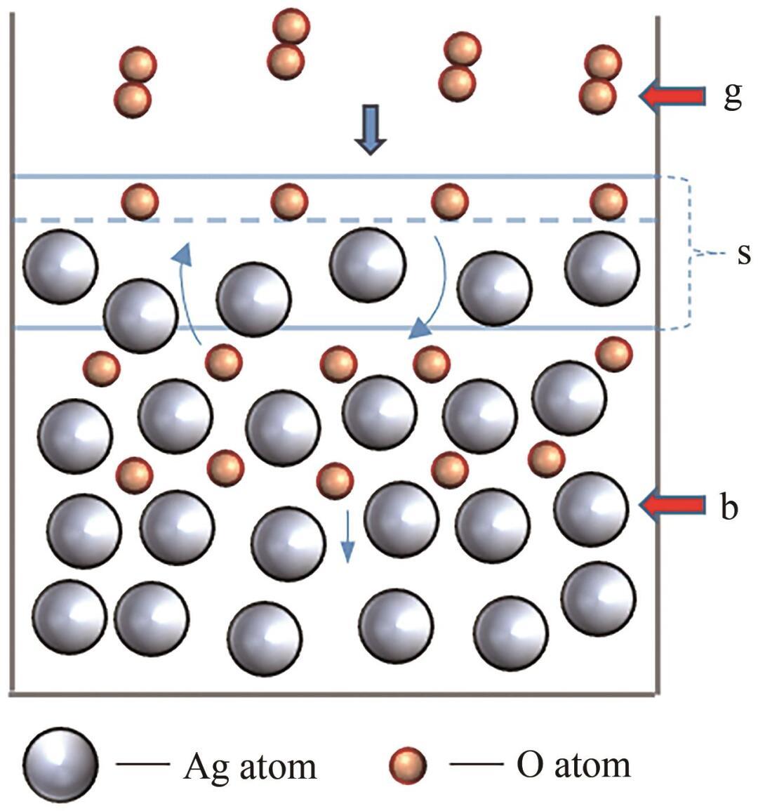 根據(jù)圖1,首先O2分子從氣相(g)擴(kuò)散至表面相(s);其次在Ag的催化下解離為O原子,并發(fā)生化學(xué)吸附;最后,O原子從表面相(s)擴(kuò)散至本體相(b)。整個過程可以表示為:
