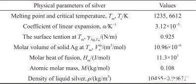 式(7)表示在整個溫度范圍內(nèi),液態(tài)Ag的表面張力與溫度的關(guān)系,相關(guān)參數(shù)的取值列于表1[21-26]。