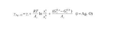 式中,γAg-O表示Ag-O系的表面張力(N/m),γi表示純組分i的表面張力(N/m),R為氣體常數(shù)[J/(mol·K)],x和x分別表示組分i在表面相和本體相中的摩爾分?jǐn)?shù)(mol/mol),Ai為組分i的摩爾表面積(m2/mol),G和G分別表示表面相和本體相中組分i的偏摩爾過剩自由能(J/mol),并且G=λG,其中λ為表面相和本體相的原子配位數(shù)之比[27]。G可由摩爾過剩自由能GE,b表示,其關(guān)系式為: