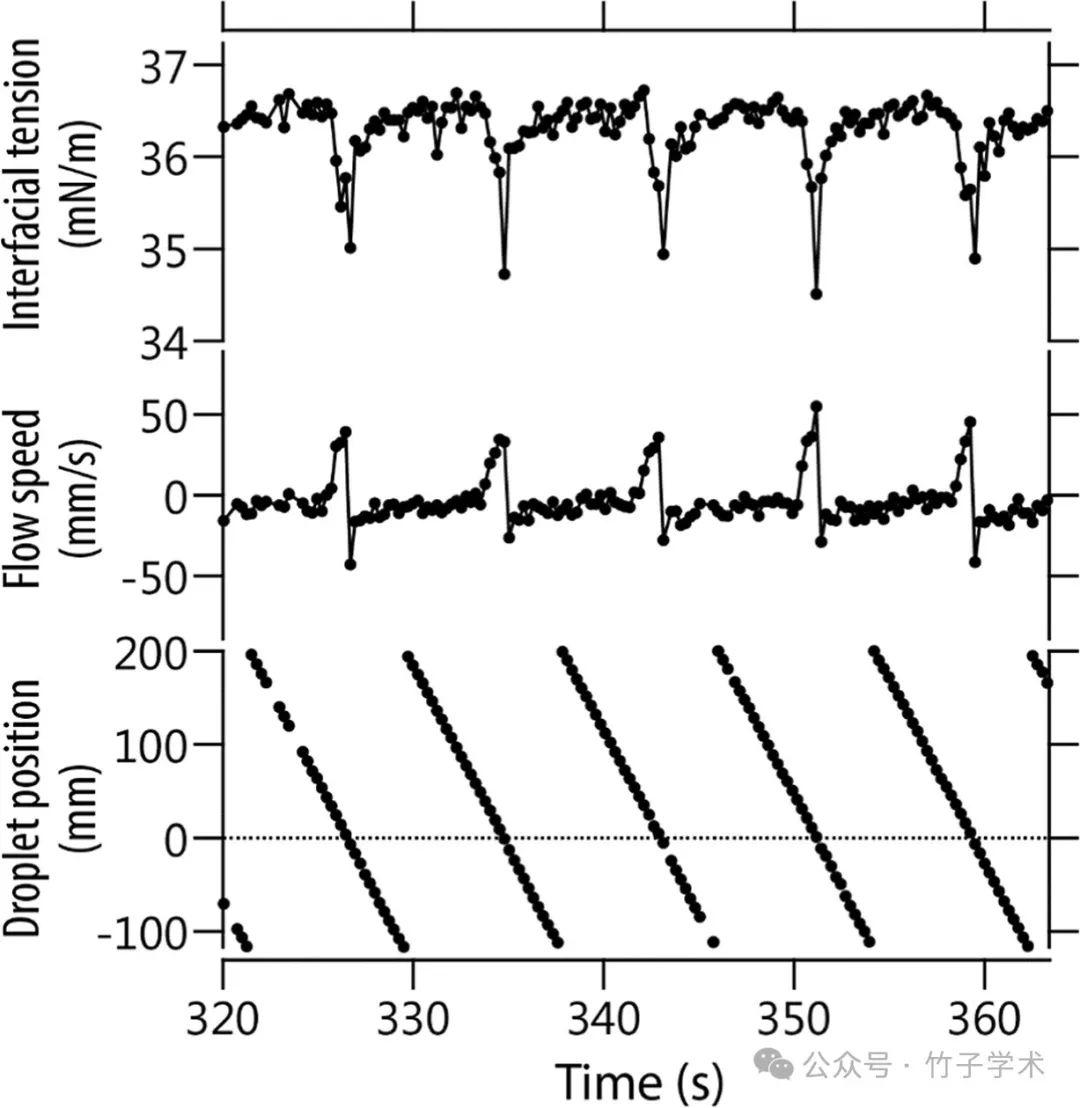 圖3是選定時間范圍內液滴位置、界面張力和表面流速的時間分辨測量的代表性結果(初始BS濃度:0μM)。