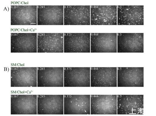 圖2.(A)hBest1/Chol單分子層、(B)hBest1/POPC/Chol(C)hBest1/SM/Chol單分子層的BAM圖像(摩爾分?jǐn)?shù)為Chol 0.167;0.285;0.375;0.444和0.5)Ca 2+的存在與否,在35±2°C。白色比例尺=100μm。