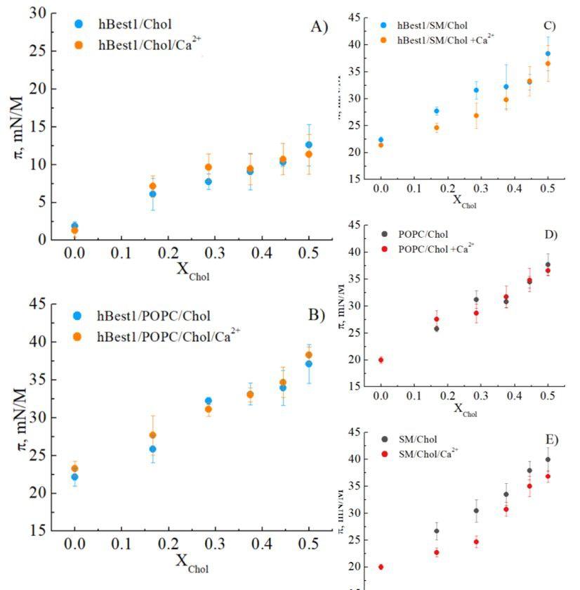 圖1.膽固醇對(A)hBest1、(B)hBest1/POPC、(C)hBest1/SM、(D)POPC和(E)SM單分子層的凝聚效應(yīng)(Chol的摩爾分?jǐn)?shù)為0.167;0.285;0.375;0.444和0.5)在存在或不存在Ca 2+的情況下,在35±2°C。數(shù)據(jù)表示為平均值±SE,n=7。