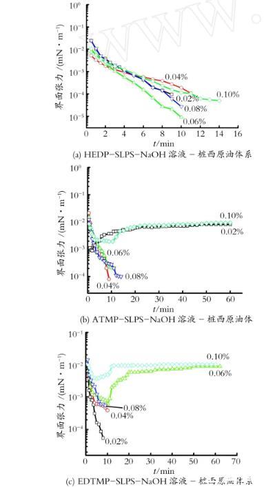圖3 HEDP-SLPS-NaOH,A TM P-SLPS-NaOH,EDTM P-SLPS-NaOH溶液-樁西原油體系的動態(tài)界面張力