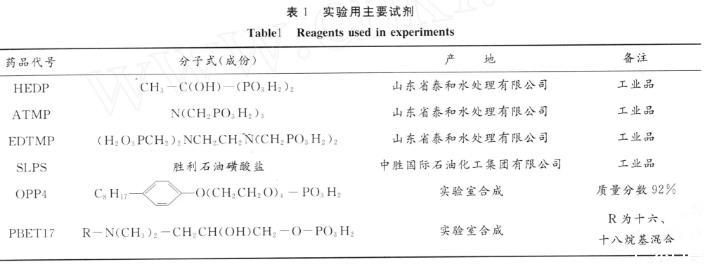 在化學驅提高采收率方法中,表面活性劑/堿復合驅的驅油效果比較好,這主要是由于堿與原油中酸性物質反應生成的活性劑與外加表面活性劑產生了協(xié)同效應,可以將油水界面張力降至低界面張力區(qū)域(10-2m N/m)甚至超低界面張力區(qū)域(10-3m N/m),并且堿可以降低活性劑在地層中的吸附。但在高堿濃度下,注入堿容易對驅油體系造成采出液處理困難、引起地層黏土分散和運移、導致地層滲透率下降等負面作用,并且堿也與油層流體及巖石礦物反應,形成堿垢,對地層造成傷害并影響油井正常生產。解決結垢問題的主要方法是加入化學防垢劑,其中有機膦酸鹽防垢劑因其良好的防垢效果而有廣泛的應用。
