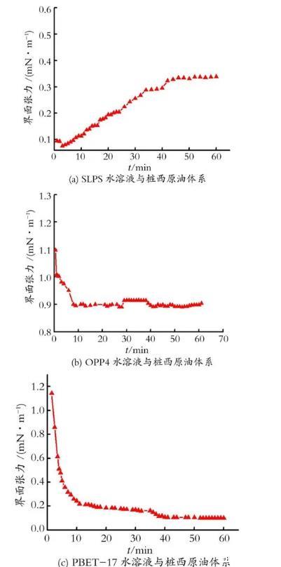 圖1 SLPS,OPP4和PBET-17水溶液-樁西原油體系油-水動態(tài)界面張力
