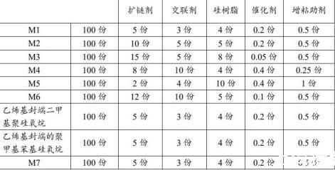硅樹(shù)脂為乙烯基MQ樹(shù)脂,乙烯基含量為0.8%,粘度為1500mPas。