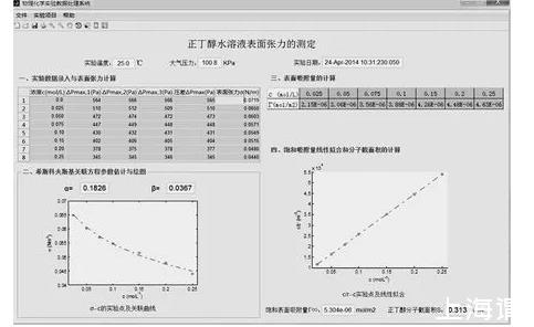 借助MATLAB工程計算平臺,通過程序設(shè)計完成了“正丁醇水溶液表面張力的測定”應(yīng)用軟件的開發(fā)。在完成錄入壓差實驗數(shù)據(jù)后,不僅可以自動計算和填入溶液的表面張力,還能夠?qū)崿F(xiàn)溶液表面張力與濃度定量關(guān)系的希斯科夫斯基經(jīng)驗方程(Szyszkowski′s equation)中待估參數(shù)的求解,并用以求導(dǎo)供給吉布斯公式計算溶液的吸附量,進而推算溶液飽和吸附量和正丁醇分子的截面積。軟件的操作過程簡便、直觀、高效,避免了人工數(shù)據(jù)處理、繪圖的煩瑣和人為誤差,可提高實驗結(jié)果的準確性和重現(xiàn)性。