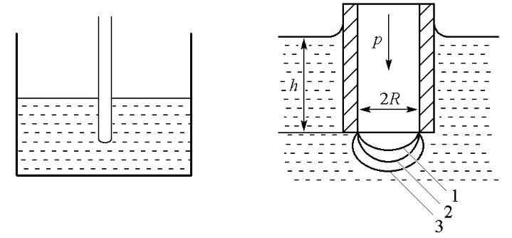 由于最大氣泡壓力法的器材易得,且易于學(xué)生理解表面張力的原理,因而一直是教學(xué)中測定液體表面張力的一種常用方法[2]。如圖1所示,測定時將一根毛細管插入待測液體內(nèi)部,從管中緩慢地通入惰性氣體對其內(nèi)的液體施以壓力,使管端形成氣泡逸出。當所用的毛細管管徑較小時,可以假定所產(chǎn)生的氣泡是球面的一部分;但是在氣泡生成及發(fā)展過程中,氣泡的曲率半徑會隨惰性氣體的壓力變化而改變。當氣泡的形狀恰為半球形時,氣泡的曲率半徑最小(即毛細管半徑R),此時根據(jù)Laplace方程,管內(nèi)外壓差達最大,其值Δpmax=p-ρgh可由差壓計測量得到[3]。利用最大壓差和毛細管半徑即可計算表面張力σ: