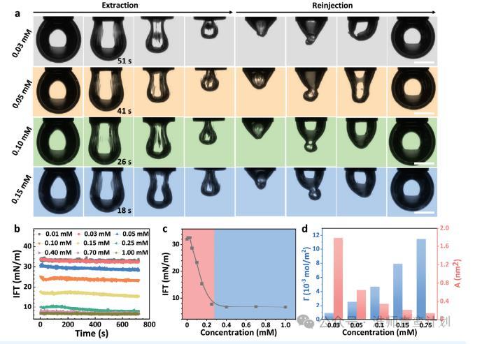 首先,在GL和SSD共組裝之前,用垂滴張力法研究了GL在水-甲苯中的界面行為。如圖1a所示,當(dāng)提取濃度為0.03、0.05、0.10和0.15 mM的甲苯中GL水溶液的液滴時,分別在51、41、26和18 s時,液滴界面面積減小,在液滴界面上出現(xiàn)了明顯的起皺。同樣,當(dāng)液滴完全虹吸到針管中并重新注入到初始體積時,起皺現(xiàn)象重新出現(xiàn),液滴由不規(guī)則逐漸擴(kuò)大到規(guī)則。抽注過程中起皺現(xiàn)象的出現(xiàn),有力地揭示了水-甲苯界面處彈性膜的形成。圖1b測量了GL溶液和甲苯之間的時間分辨界面張力(IFT)。當(dāng)GL濃度<0.03 mM時,甲苯與GL溶液之間的界面張力近似等于純水與甲苯之間的界面張力(≈32 mN·m?1)。隨著GL溶液濃度從0.03增加到0.25 mN·m?1,界面張力下降到6.8 mN·m?1,而從0.25到1.00 mM,界面張力保持在6.8 mN·m?1不變當(dāng)GL濃度<0.03 mM時,甲苯與GL溶液之間的界面張力近似等于純水與甲苯之間的界面張力(≈32 mN·m?1)。隨著GL溶液濃度從0.03增加到0.25 mM,界面張力下降到6.8 mN·m?1,而從0.25到1.00 mM,界面張力保持在6.8 mN·m?1不變。據(jù)此,確定0.25 mM為GL分子在水-甲苯界面處的臨界膠束濃度(CMC)(圖1c)。這意味著液滴在GL的CMC以下會發(fā)生收縮,而在CMC以上液滴會發(fā)生起皺。為了進(jìn)一步解釋這一現(xiàn)象,我們計算了不同濃度下GL分子的界面吸附容量和截面積。圖1d我們可以看到GL的界面吸附量隨濃度的增加成比例增加,相反,隨著濃度的增加,橫截面積減小。綜上所述,GL是一種特殊的兩親分子,可以在油水界面形成界面膜。