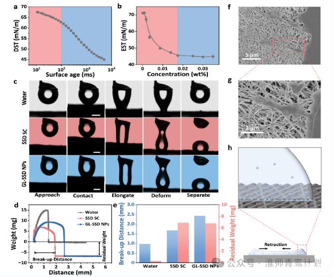 然后,作者研究了GL-SSD NPs液滴在疏水表面的沉積機(jī)理。先是測量了GL-SSD NPs溶液的動態(tài)表面張力(DST)和粘度。DST結(jié)果顯示,GL-SSD NPs溶液在前100 ms內(nèi)發(fā)生輕微變化,這意味著GL-SSD NPs的擴(kuò)散速率較慢,EST值隨著濃度從0到0.018 wt%的增加而減小到45 mN m?1,而當(dāng)濃度高于0.018 wt%時,EST值保持不變。因此,0.018 wt%作為GL-SSD NPs的臨界膠束濃度(CMC)清楚地觀察到接近、接觸、伸長、變形和分離的順序過程。從PTFE表面分離后,水滴從表面被徹底清除,沒有留下任何殘留物,而SSD SC和GL-SSD NPs液滴在中間發(fā)生了明顯的伸長和斷裂,在表面保留了大量的液體。水、SSD SC和GL-SSD NPs的殘余質(zhì)量分別為0.35、6.9和6.8 mg,而GL-SSD NPs溶液的破裂距離為2.43 mm,遠(yuǎn)高于水和SSD SC的0.97 mm和1.68 mm,表明GLSSD NPs與PTFE表面的相互作用最強(qiáng)。此外,掃描電鏡(SEM)圖像顯示,撞擊后的縮回軌跡中留下了大量的液滴殘留物。在液滴撞擊過程中,大量GL-SSD NPs在三線處的沉積會利用PTFE表面固有的親水性改變其潤濕性,產(chǎn)生固定點(diǎn),延緩液滴縮回。