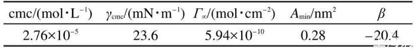 長(zhǎng)期以來(lái),在表面活性劑復(fù)配應(yīng)用過程中把烷基季銨鹽CTAB與陰離子型表面活性劑的復(fù)配視為禁忌,一般認(rèn)為兩者在水溶液中相互作用會(huì)產(chǎn)生沉淀,從而使表面活性劑失去表面活性。然而,在我們的研究中,發(fā)現(xiàn)烷基季銨鹽CTAB與含有聚氧乙烯鏈的陰離子型表面活性劑AES在40°C以上混合時(shí)可形成穩(wěn)定的溶液。由于其親水基間強(qiáng)烈的吸引,該復(fù)配體系具有極其優(yōu)異的表面性質(zhì),其cmc低至2.8×10-5mol·L-1,同時(shí)γcmc低至23.6 mN·m-1,這兩個(gè)重要的表面性質(zhì)指標(biāo)均達(dá)到常規(guī)表面活性劑體系所能達(dá)到的最優(yōu)異的結(jié)果。相關(guān)的表面性質(zhì)和β參數(shù)經(jīng)Gibbs吸附公式和規(guī)則溶液理論計(jì)算后列于表1中。