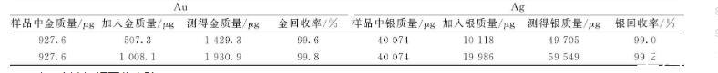 稱取兩份2.0 g(精確至0.000 1 g,金含量463.8 g/t,銀含量20 037 g/t)粗鉍樣品,分別加500、1 000μg金和10 000、20 000μg銀,按照實(shí)驗(yàn)方法氧化、除鉍、火法富集,進(jìn)行分析,測得金銀含量和加標(biāo)回收率見表6。