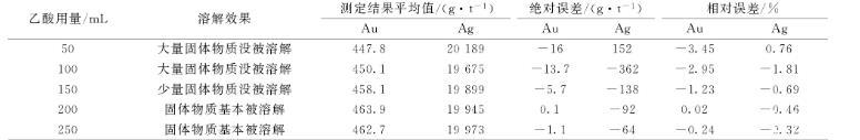 實(shí)驗(yàn)樣品金含量463.8 g/t,銀含量20 037 g/t,進(jìn)行除鉍用酸量的實(shí)驗(yàn),試驗(yàn)用酸為乙酸(1+1),結(jié)果見表5,從結(jié)果可以看出50、100 mL乙酸用量,大部分固體物質(zhì)沒被溶解,大部分鉍沒被除去,乙酸用量200 mL時(shí),固體物質(zhì)基本被溶解,結(jié)果較準(zhǔn)確,可以滿足測定要求。在結(jié)果準(zhǔn)確的情況下選擇用量少的,所以實(shí)驗(yàn)選擇乙酸用量為200 mL。