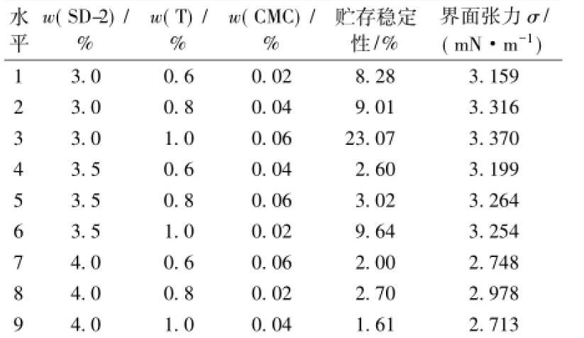 乳化劑SD-2,締合型增稠劑T和羧甲基纖維鈉等是CA砂漿陰離子乳化瀝青中最關(guān)鍵的3種組分,對(duì)乳化瀝青的性能起著決定性的影響。為了比較對(duì)油水界面張力和乳化瀝青貯存穩(wěn)定性的影響,采用L9(34)正交試驗(yàn)的方法進(jìn)行優(yōu)化設(shè)計(jì),因素水平見(jiàn)表1。