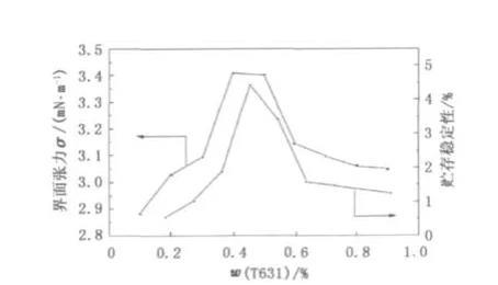 圖3締合型增稠劑T對(duì)油水界面張力和貯存穩(wěn)定性的影響