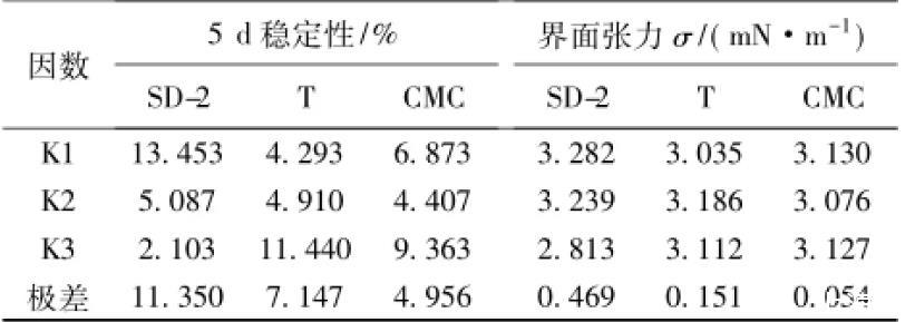 根據(jù)正交試驗(yàn)表,配制不同配合比的皂液,調(diào)節(jié)pH值為11,制備乳化瀝青測(cè)定其貯存穩(wěn)定性,并測(cè)定不同配合比的皂液與瀝青甲苯模擬油的界面張力,結(jié)果見(jiàn)表2。對(duì)試驗(yàn)結(jié)果進(jìn)行對(duì)比分析和極差分析,結(jié)果見(jiàn)表3。