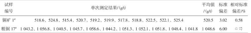 稱取20.00 g樣品,銅礦、銅渣樣直接干法試金配料,按試驗方法進行分析,結果見表4和表5。