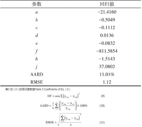 2.4.2實驗數(shù)據(jù)回歸及模型參數(shù)的求取本研究系統(tǒng)收集了文獻數(shù)據(jù),并將研究測定的實驗數(shù)據(jù),共計932個數(shù)據(jù)用于回歸,回歸所用數(shù)據(jù)見表2。回歸參數(shù)由最小二乘法得到,其目標(biāo)函數(shù)如式(9)所示。采用平均相對偏差(AARD)和均方根誤差(RMSE)表示計算效果,如式(10)、式(11)所示。回歸結(jié)果見表3。