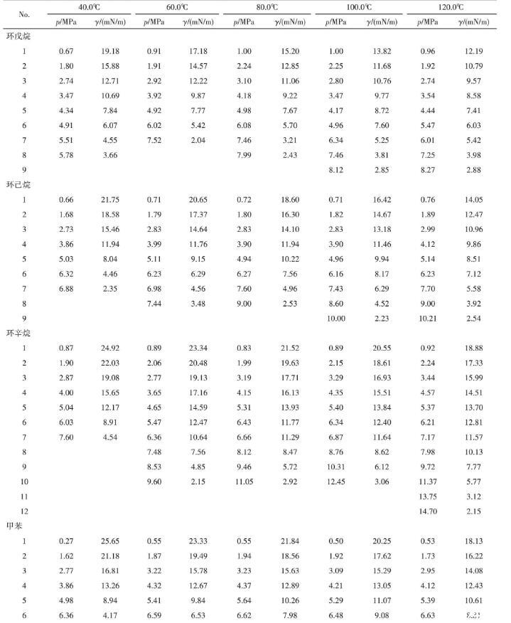 (5)對實驗所測以及文獻的數(shù)據(jù)進行了關(guān)聯(lián),其平均相對偏差為11.01%。結(jié)果表明,此經(jīng)驗方程可較好地用于CO2-正構(gòu)烷烴/環(huán)烷烴/芳香烴體系界面張力的計算。且與狀態(tài)方程結(jié)合密度梯度理論相比,無需相平衡數(shù)據(jù)及影響因子參數(shù),應(yīng)用更為簡便。可為今后計算多元組分界面張力提供支持。