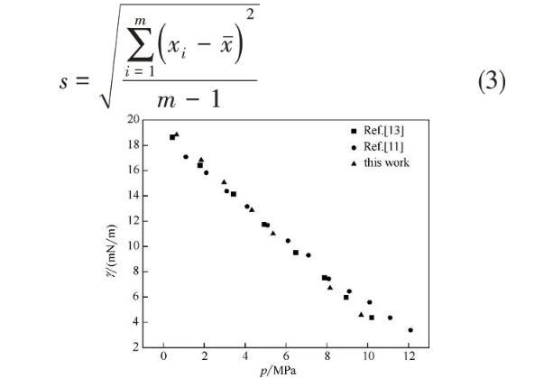 本研究測定了CO2-環(huán)戊烷/環(huán)己烷/環(huán)辛烷/甲苯/乙苯/乙基環(huán)己烷體系的界面張力,測量的溫度范圍為40~120℃,壓力范圍為0.27~14.70 MPa。實驗數(shù)據(jù)見表1。并繪出實驗數(shù)據(jù)的標(biāo)準(zhǔn)差圖,結(jié)果如圖3所示。結(jié)果表明,所有數(shù)據(jù)的標(biāo)準(zhǔn)差均在0.36 mN/m以內(nèi),證明數(shù)據(jù)的準(zhǔn)確性較好。其中,標(biāo)準(zhǔn)差的計算如式(3)所示