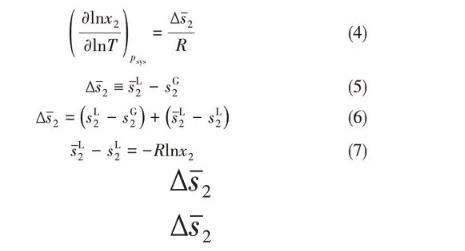 溫度對界面張力的影響比較復(fù)雜,首先溫度影響界面張力隨壓力的下降速度,隨著溫度的升高,界面張力下降速度越來越緩,使得不同等溫線在某個壓力范圍內(nèi)有交叉點;其次,不同區(qū)域內(nèi),溫度對界面張力的影響不同。在交叉點以上,界面張力隨溫度的升高而減小,而交叉點之下,界面張力隨溫度的升高而增大。為了分析溫度對CO2溶解度的影響,將Gibbs-Helmholtz方程計算的溶解度對溫度的導(dǎo)數(shù)與偏摩爾熵聯(lián)系起來,如式(4)~式(7)所示