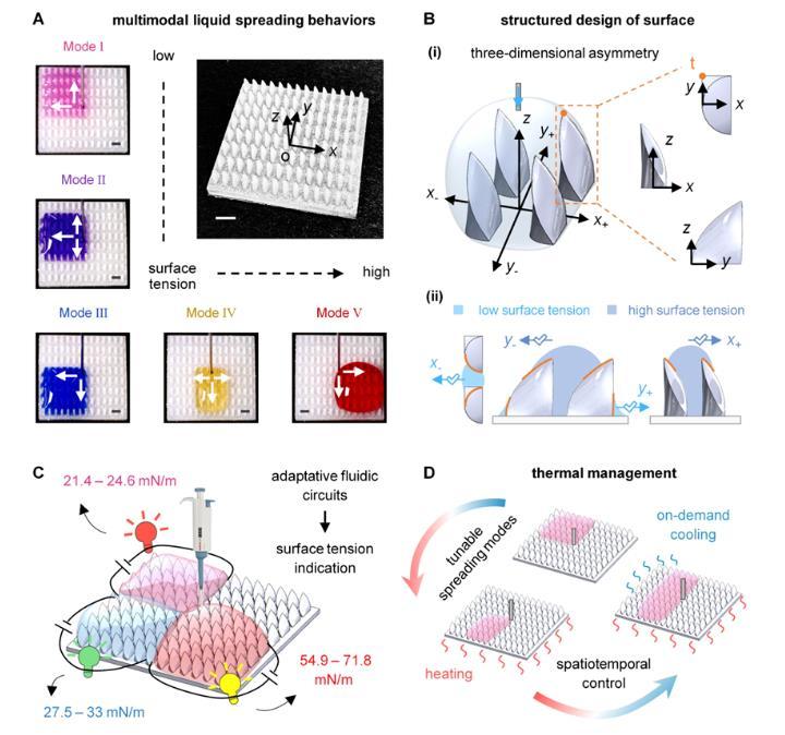 為實現(xiàn)多向調(diào)控液體,香港理工大學(xué)王立秋教授團隊提出了由陣列式三維不對稱尖牙結(jié)構(gòu)單元組成的結(jié)構(gòu)化表面,為不同表面張力液體定制運輸方向,并呈現(xiàn)出五種新穎的運輸模式(圖1)。這種智能調(diào)控液體的能力源于所設(shè)計表面單元自下而上分布的多曲率特征,在三維空間上交替地主導(dǎo)液體表面的局部拉普拉斯壓差,從而原位控制不同潤濕性液體的多樣定向運輸模式。該表面根據(jù)液體特性實施多模式控制的能力使其具備傳統(tǒng)結(jié)構(gòu)化表面難以實現(xiàn)的創(chuàng)新功能,如構(gòu)建自適應(yīng)液體電路、便攜式表面張力指示器、智能調(diào)控液體及按需熱管理。該研究以“In Situ Multi-Directional Liquid Manipulation Enabled by 3D Asymmetric Fang-Structured Surface”為題發(fā)表于《Advanced Materials》,團隊博士生孫思琦為論文第一作者,王立秋講席教授為通訊作者,張藝媛研究助理教授為共同通訊作者。
