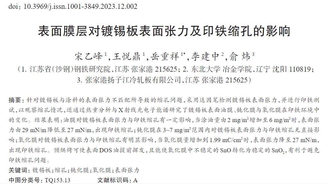 結(jié)果表明:油膜對鍍錫板表面張力與印鐵縮孔有一定影響,當(dāng)涂油量由2 mg/m2增加至6 mg/m2時,表面張力由29 mN/m降低至27 mN/m,出現(xiàn)印鐵縮孔;鈍化膜在3——7 mg/m2范圍內(nèi)對鍍錫板表面張力與印鐵縮孔無直接影響;氧化膜對鍍錫板表面張力與印鐵縮孔有明顯影響,當(dāng)氧化膜量增加到1.99 mC/cm2時,表面張力降至27 mN/m,出現(xiàn)印鐵縮孔。預(yù)烘烤可使表面DOS油提前揮發(fā),且能使氧化膜中不穩(wěn)定的SnO轉(zhuǎn)化為穩(wěn)定的SnO2,有利于避免印鐵縮孔問題。