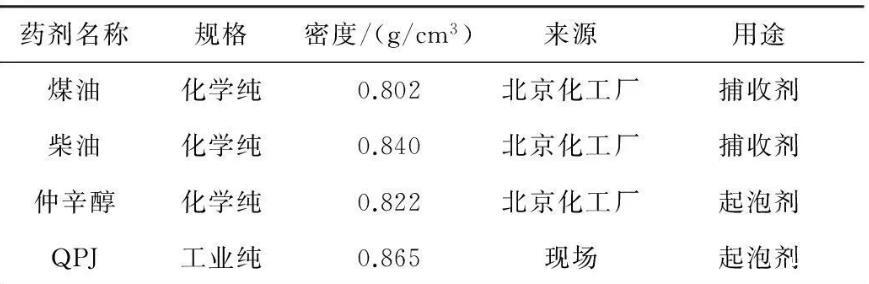 浮選藥劑有煤油、柴油、仲辛醇和QPJ,其基本性質(zhì)及用途見表1。
