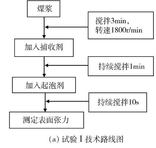 試驗(yàn)分為試驗(yàn)Ⅰ和試驗(yàn)Ⅱ兩部分。在試驗(yàn)Ⅰ中,先后改變捕收劑和起泡劑用量,對添加浮選藥劑后煤漿的表面張力進(jìn)行測定,以研究浮選藥劑用量對煤漿表面張力影響的規(guī)律。在試驗(yàn)Ⅱ中選用煤油/仲辛醇做捕收劑/起泡劑,先后改變煤油和仲辛醇的用量,按照《GB/T 4757-2013煤粉(泥)實(shí)驗(yàn)室單元浮選試驗(yàn)方法》對馬蘭2#煤泥進(jìn)行浮選試驗(yàn),并在浮選充氣前對煤漿同步進(jìn)行表面張力的測定,進(jìn)一步對浮選過程中浮選藥劑量、煤漿表面張力及浮選效果之間的關(guān)系進(jìn)行探索。試驗(yàn)控制煤漿濃度為100 g/L,溫度為22±0.2℃;使用一次去離子水(pH值為7.0±0.2)。試驗(yàn)技術(shù)路線見圖1。