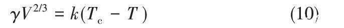 式中,γ是樣品在溫度T下測得的表面張力;V是液體的摩爾體積;Tc是臨界溫度;k是經(jīng)驗常數(shù)。將實驗值γ和V2/3的乘積相對于熱力學溫度T進行線性回歸,并獲得一條直線,從直線和截距的斜率,可以得到k和Tc的值。對于大部分有機液體來說,k大約為2.1×10-7J·K-1,而對于簡單熔鹽,k比較小,NaCl的k≈10-7J·K-1。
