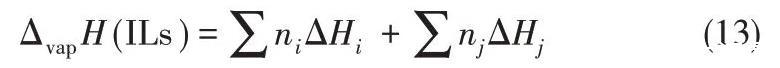 2008年,Verevkin[71]開發(fā)了一種基于經(jīng)驗公式的簡單相加法來計算ILs的蒸發(fā)焓,該焓被分解為構成元素的主要成分和輔助成分的校正(基于結構上的特殊性,例如CF3基團或環(huán)狀結構的存在)