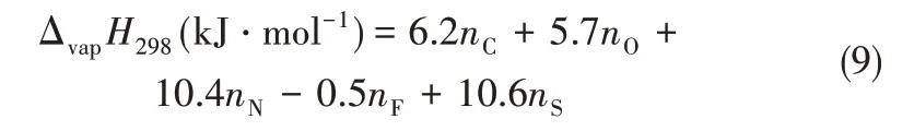 2005年,Kabo等[37]用Knudsen滲流法測出了[C4mim][Tf2N]的蒸氣壓,從而計算得到汽化焓,Kabo等基于有效原子的相加性提出式(9)計算298 K的汽化焓