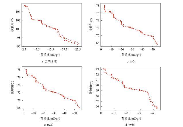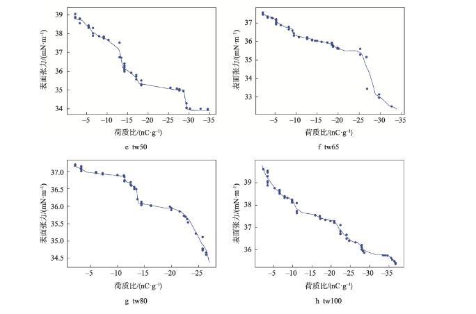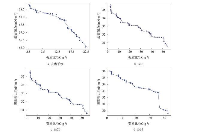 隨著膜液中吐溫20的減少和司盤(pán)20的增多,明膠液滴荷質(zhì)比亦呈增高趨勢(shì)(<0.05)。張建桃等[13]研究表明,介質(zhì)的電導(dǎo)率改變會(huì)引起其荷電性能的改變。相同質(zhì)量濃度下司盤(pán)20的物質(zhì)的量濃度更高,導(dǎo)致溶液電導(dǎo)率及液滴荷質(zhì)比增加更為明顯。然而,與只添加吐溫20的明膠溶液(tw100)相比,少量司盤(pán)20的添加(tw80)還會(huì)引起荷質(zhì)比的顯著減少(<0.05),推測(cè)這是由于溶液中吐溫20與司盤(pán)20分子通過(guò)“經(jīng)典疏水作用”在水溶液中優(yōu)先結(jié)合,從而使溶液中總?cè)苜|(zhì)相對(duì)濃度下降導(dǎo)致[14]。
