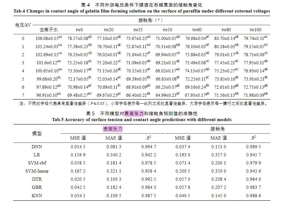 液滴的荷質(zhì)比為荷電后的本質(zhì)特性,而表面張力和接觸角則為荷電液滴表現(xiàn)的外在特性。為了訓(xùn)練機(jī)器學(xué)習(xí)模型,以荷質(zhì)比作為輸入特征,將表面張力、接觸角測(cè)量值轉(zhuǎn)化為神經(jīng)網(wǎng)絡(luò)可以處理的張量后進(jìn)行訓(xùn)練,使模型預(yù)測(cè)值盡可能地接近實(shí)際測(cè)量值,實(shí)驗(yàn)結(jié)果如表5所示。無(wú)論是表面張力還是接觸角,SVM-linear的2最低,為0.938 4和0.943 6,表明該模型預(yù)測(cè)效果最差。SVM-linear作為一種基于線性核函數(shù)的支持向量機(jī)模型,對(duì)噪聲和異常值非常敏感,且參數(shù)調(diào)優(yōu)較為困難[20]。DNN的2最接近1,且MSE值和MAE值最小(表面張力的MSE值和MAE值分別為0.014 5和0.081 3,接觸角的MSE值和MAE值分別為0.037 4和0.151 0),表明該模型預(yù)測(cè)性能最好。DNN具有非線性特征學(xué)習(xí)、自動(dòng)特征提取和分層特征學(xué)習(xí)等優(yōu)勢(shì),能夠適應(yīng)大規(guī)模數(shù)據(jù)并進(jìn)行調(diào)優(yōu)[21]。Pfisterer等[22]通過(guò)DNN建立評(píng)估商業(yè)果泥食品的營(yíng)養(yǎng)密度,其平均準(zhǔn)確率達(dá)92.2%。荷質(zhì)比與表面張力、接觸角的模型預(yù)測(cè)如圖2、圖3所示,可以發(fā)現(xiàn)模型對(duì)實(shí)際數(shù)據(jù)具有良好的擬合效果。通過(guò)模型曲線可以確定,在任意荷質(zhì)比下,去離子水液滴與明膠液滴的表面張力及其在石蠟表面的接觸角,為預(yù)測(cè)可食性膜液在食品表面的潤(rùn)濕黏附性提供了思路和手段。