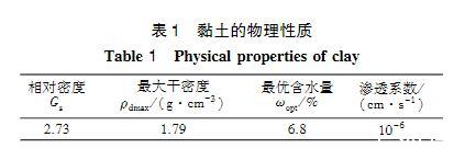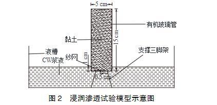 浸潤滲透試驗?zāi)P腿鐖D2所示,主要由液槽、支撐三腳架和透明有機玻璃管組成。有機玻璃管直徑5cm,高15cm,頂端敞開,底部封閉鉆有直徑0.5cm的進(jìn)漿孔。試驗時將黏土裝入有機玻璃管中,振搗壓實,底部開孔處墊有紗網(wǎng),防止土體掉落。將有機玻璃管和支撐三腳架放入漿液槽內(nèi),有機玻璃管底部浸入漿液液面以下1.0cm,使?jié){液從底部滲入黏土中,通過觀察漿液在不同時間的滲透高度來評價漿液的浸潤滲透效果。