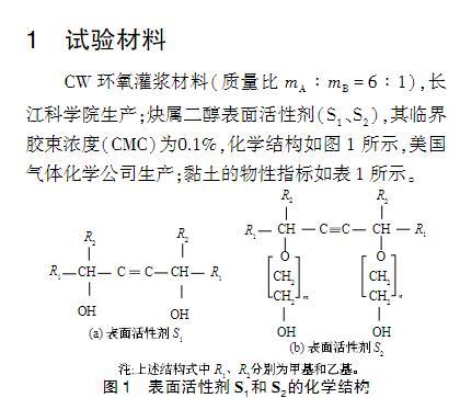 對于環(huán)氧樹脂灌漿材料,加入表面活性劑對漿液的黏度、表面張力、接觸角、固化物的力學(xué)性能及對被灌體的滲透性有何影響?目前這方面的的研究少見報道。而這些研究對環(huán)氧灌漿材料的開發(fā)以及灌漿施工都具有非常重要的意義。本文以長江科學(xué)院CW環(huán)氧灌漿材料為改性對象,加入非離子表面活性劑炔屬二醇對其改性,研究表面活性劑對環(huán)氧漿液的黏度、表面張力、接觸角、滲透性和漿液固結(jié)體力學(xué)性能的影響,在此基礎(chǔ)上探討了表面活性劑降低漿液表面張力、接觸角以及提高漿液滲透性的機理。