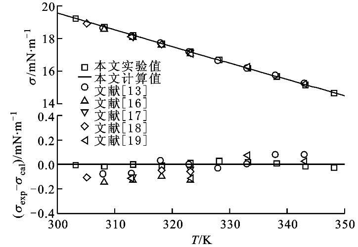 圖3正庚烷表面張力實驗值與擬合方程和文獻(xiàn)值的比較