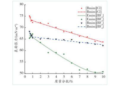 圖2表面張力與離子液體質(zhì)量分?jǐn)?shù)之間的關(guān)系