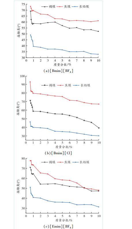 對(duì)于光滑的煤樣,離子液體對(duì)煤樣的潤濕程度采用接觸角作為評(píng)價(jià)指標(biāo)。3種煤樣的接觸角與不同離子液體質(zhì)量分?jǐn)?shù)之間的關(guān)系如圖3所示。