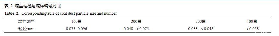 將EMI原液稀釋至質(zhì)量分數(shù)分別為0.1%、0.2%、0.4%、0.6%、0.8%、1.0%、2.0%、4.0%、6.0%、8.0%的混合溶液。實驗煤樣選取黃陵一號煤礦弱黏煤樣,煤樣工業(yè)分析結果見表1。在制備煤塵樣品時,根據(jù)有關文獻對黃陵一號煤礦綜采工作面煤塵粒徑分布進行檢測,并結合國際標準化組織對粉塵粒徑的定義,以及實驗室制備條件,去除煤塊外表皮,使用破碎機對煤心破碎60 s,用160、200、300、400目標準工業(yè)篩對煤粉進行篩分,共篩分出0.075~0.096、0.048~<0.075、0.038~<0.048、<0.038 mm共4個粒度范圍的樣品進行實驗,其中煤塵粒徑與煤樣編號見表2。煤樣制備完成后,將其放入80℃的真空干燥箱,真空干燥8 h后密封保存以備實驗使用。
