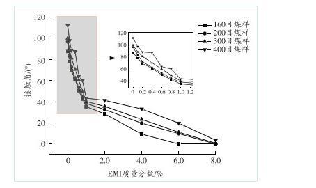 由圖5可知,針對160目測試煤樣,溶液中EMI質(zhì)量分?jǐn)?shù)大于2.0%后,接觸角的減小率更高,當(dāng)溶液中EMI質(zhì)量分?jǐn)?shù)為6.0%時,接觸角為0°,煤樣被快速潤濕,達(dá)到完全潤濕狀態(tài)。EMI質(zhì)量分?jǐn)?shù)相同時,200目與300目測試煤樣的變化趨勢大致相同。200目測試煤樣在EMI質(zhì)量分?jǐn)?shù)小于1.0%的溶液時,接觸角呈線性減小趨勢,當(dāng)大于1.0%后,接觸角減小率出現(xiàn)先逐漸變緩而后逐漸增大的細(xì)微波動;300目測試煤樣在EMI質(zhì)量分?jǐn)?shù)為0.1%~0.6%時,接觸角減小率出現(xiàn)細(xì)微波動,呈先變緩后逐步增大的趨勢;當(dāng)溶液中EMI質(zhì)量分?jǐn)?shù)達(dá)到8.0%時,兩組測試煤樣均達(dá)到完全潤濕狀態(tài),接觸角為0°。而400目測試煤樣的煤塵粒徑最小,煤樣的潤濕性較弱,當(dāng)溶液中EMI質(zhì)量分?jǐn)?shù)為0.8%~2.0%時,接觸角減小率呈先逐漸增大而后逐漸變緩的趨勢;當(dāng)溶液中EMI質(zhì)量分?jǐn)?shù)大于2.0%時,接觸角的減小率呈線性降低趨勢;當(dāng)溶液中EMI質(zhì)量分?jǐn)?shù)達(dá)到8.0%時,煤樣還未達(dá)到完全潤濕狀態(tài)。