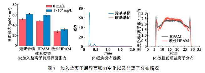 部分儲層中存在較高的礦化度,為此進一步研究鹽離子對界面張力的影響。在3個體系的水相中分別加入質量濃度為100 g/L的NaCl,觀察其對界面張力的影響情況,結果見圖7(a)。可以看出,對于沒有聚合物存在的體系中,界面張力會隨著鹽離子的增加而增大。這是由于鹽離子的存在增大了水相的極性,從而拉大了油水兩相性質上的差距,增大了油水界面張力。因此當界面處的鹽離子增多時,界面張力則會增大。加入HPAM的體系中也出現了類似的情況。然而引入磺酸基團改性后的HPAM則受鹽離子的影響較小。為了解釋這一現象的物理機制,分析了帶電基團周圍Na+分布(圖7(b))。通過計算徑向分布函數g(r),發(fā)現羧酸基團周圍吸引了較多的Na+,導致Na+在聚合物附近聚集,而改性引入的磺酸基團具有一定的抗鹽作用,其周圍分布的Na+數量更少。這也就導致2種體系界面附近Na+密度不同(圖7(c))。由于HPAM含有較多的羧酸基團,會引起Na+在聚合物附近的富集,導致界面張力的增加。而在加入改性HPAM后,引入的磺酸基團對Na+的吸引力較弱,導致界面附近的Na+和改性前相比有明顯的減少,界面張力增加較少。因此加入磺化改性的HPAM在高礦化度下仍然可以保持較高的界面活性。