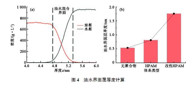 界面層厚度能夠反映油水界面處兩相的混合情況,一般來說界面厚度越大說明兩相之間的排斥越小,互溶效果越好,界面張力越低。參考Ricardo Paredes等的方法,選取密度低于油和水密度峰值90%的區(qū)域作為油水混合界面,如圖4(a)所示。計算得到的界面層厚度見圖4(b)。可以發(fā)現,加入HPAM對于界面層影響很小,改性HPAM的加入可以大幅提高油水界面層厚度。這也反映出未改性HPAM油水界面依然比較清晰,兩相界限明顯,界面處油分子和水分子受力不均勻的現象依然嚴重;改性HPAM疏水基團進入油相中,引起z方向油水分布重疊區(qū)域變大,油水界面區(qū)域擴展,油水界面變得凹凸不平,油水相的“螯合”加強,界面處分子受力不均衡得到了緩解,有利于界面張力降低。