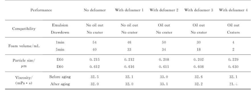 消泡劑的消泡能力與乳液的相容性成反比關(guān)系。消泡劑1和2與乳液的相容性最好,但因為部分溶解于乳液中,使消泡強(qiáng)度減弱;而消泡劑4與乳液的相容性最差,雖然具有極強(qiáng)的消泡性,但是因為過于疏水而難與乳液相容,所以容易造成表面缺陷。消泡劑3與乳液的相容性與消泡能力較為平衡,是最佳的消泡劑選擇。