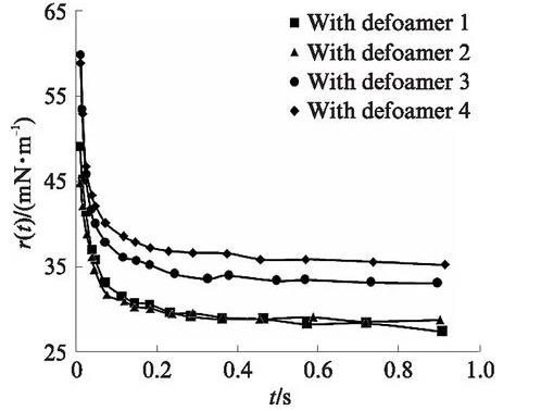 圖1是添加消泡劑后起泡液(0.2%二異辛基琥珀磺酸鈉鹽水溶液)的動態(tài)表面張力r(t)與時間t的關(guān)系圖。由圖1可以看出:在同樣的添加量下,分子級消泡劑(消泡劑1、2)可使起泡液具有更低的動態(tài)表面張力,這與其雙子結(jié)構(gòu)有關(guān);有機(jī)消泡劑(消泡劑3、4)在起泡物質(zhì)的協(xié)同作用下,也具有一定的降低起泡液動態(tài)表面張力的能力;在起泡液中,不論是加入分子級消泡劑還是有機(jī)消泡劑,在時間趨于1s時,其表面張力都低于36mN/m.