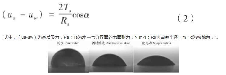 由上式可以看出,基質(zhì)吸力的大小與表面張力、接觸角和曲率半徑有關(guān)。其中,基質(zhì)吸力的大小與表面張力成正比,與彎液面曲率半徑成反比。因此,表面張力和曲率半徑的變化均會(huì)導(dǎo)致基質(zhì)吸力的改變。在環(huán)境溫度為25℃時(shí),通過(guò)JC2000型接觸角測(cè)量?jī)x對(duì)三種試樣的孔隙液體進(jìn)行接觸角測(cè)量。得到三種不同表面張力液滴的幾何形態(tài)圖如圖4所示,測(cè)量可得純水、酒精溶液和肥皂水對(duì)應(yīng)的接觸角分別為85°、65°和42°,而在25℃環(huán)境下,純水、20%酒精溶液、2 g L-1肥皂水的表面張力系數(shù)分別為:7.1×10-2N m-1、4.1×10-2N m-1、2.9×10-2N m-1。表面張力是決定彎液面形狀的主要因素之一,會(huì)影響曲率半徑和接觸角的大小。很顯然,表面張力大的液體接觸角變大,曲率半徑變小。圖4中水滴表面張力大于酒精溶液,但形成的彎液面半徑卻要小于酒精溶液,同樣的,酒精溶液形成的彎液面半徑又小于肥皂水。曲率半徑越小,土體中的基質(zhì)吸力越大。孔隙水表面張力會(huì)對(duì)彎液面的曲率半徑產(chǎn)生改變從而對(duì)基質(zhì)吸力產(chǎn)生影響,最終影響土壤的收縮開(kāi)裂。