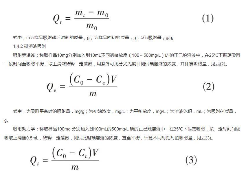 吸附動(dòng)力學(xué):稱(chēng)取樣品100mg分別加入到100mL的500mg/L碘的正己烷溶液中,在25℃下振蕩吸附,按一定時(shí)間間隔吸取上清液0.5mL,稀釋一定倍數(shù),測(cè)試此時(shí)碘溶液的濃度,直至平衡,計(jì)算不同時(shí)刻時(shí)的吸附量,見(jiàn)式(3)。