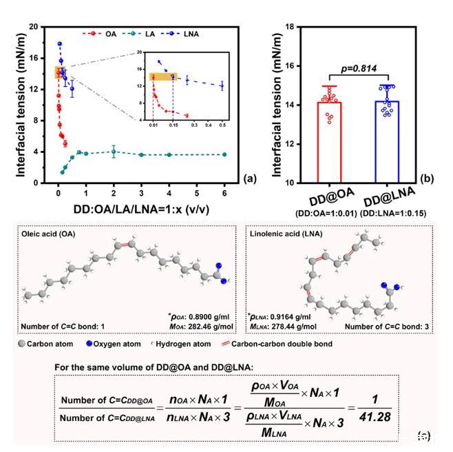 圖1.模型油脂的篩選:(a)油酸/亞油酸/亞麻酸與十二烷不同體積比例復(fù)配后的油-水界面張力;(b)最終篩選得到的兩種模型油相的界面張力(DD OA和DD LNA);(c)相同體積下,DD OA與DD LNA分子內(nèi)的碳-碳雙鍵比例
